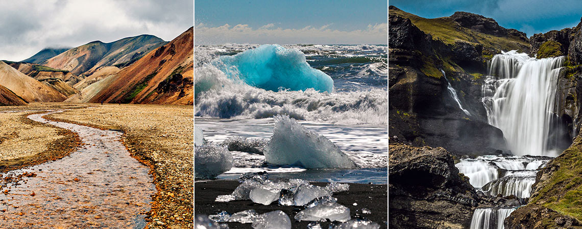 Entdecken Sie blaue Gletscher, endlose Lavafelder, natürliche heiße Quellen und Geysire, unberührte vulkanische Strände, Flüsse, atemberaubende Wasserfälle, Fjorde und Vulkane. Erleben Sie die ungewöhnliche Tier- und Pflanzenwelt Islands.